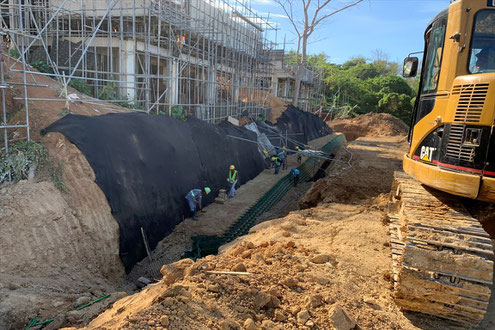 ジオブロックで土台と壁を固めた後は、道路は埋め戻されて、アスファルト舗装が行われます。コンクリート流し込みなど、リゾート建設には大量の水を使用しますが、リゾート建設地には2本の井戸を作っており、飲用も出来るレベルの水が利用できます。