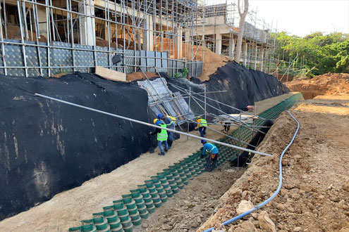 緑色をした部分がジオブロックです。ジオブロックを固めて壁を作っていく様子が判ります。これにより強固で壊れにくい壁が出来ます。すぐ上の部分には各ビラの土台の柱が見えますが、土中に深く埋め込まれています。最新土木工学・シビルエンジニアリングに基づいた強度計算がされています。