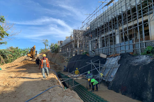 平屋戸建てリゾートビラを100戸ほど建設していますが、4つの段差があるステージには、周回道路が走っています。アメリカで特許を取っている最新鋭のジオブロックと呼ばれる建設資材を使って壁の部分に敷き詰めており、基礎工事からしっかりと固めています。