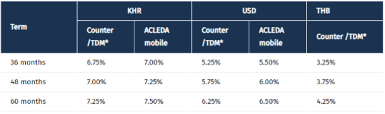 カンボジア・アクレダ銀行の定期預金金利(例)